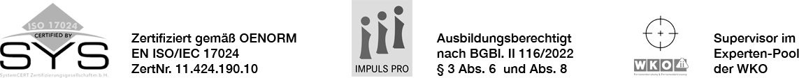 Mag. Werner C. Hantinger: Kommunikationswissenschaftler. Dipl. Psychosozialer Berater. Fachtrainer & Prüfer der SystemCert, zertifiziert n. ISO 17024. Supervisor im Experten-Pool der WKO. Entwickler zahlreicher Aus- und Weiterbildungen, Konzepte und Initiativen. Lehrtrainer und Lehrsupervisor. Ausbildungsberechtigt n. BGBl. II 116/2022 § 3 Abs. 6 (Psychosoziale Einzel- und Gruppenselbsterfahrung), Abs. 8 (Einzel- und Gruppensupervision), sowie für wissenschaftliches Arbeiten, Berufsethik, Methodik und Krisenintervention. Lehrbeauftragter der Alpen-Adria Universität Klagenfurt seit 2005.